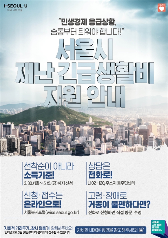 재난 긴급생활비 신청은 30일부터 서울시 복지포털을 통해 할 수 있으며, 접수된 날로부터 7일 이후 모바일 서울사랑상품권 또는 선불카드로 지급된다.