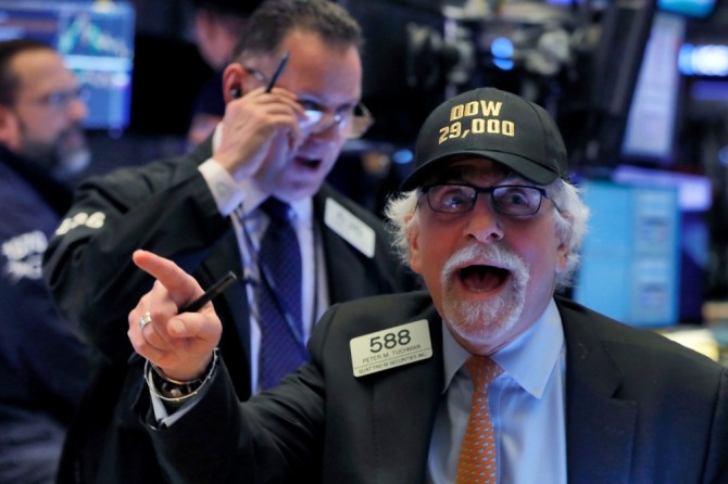 미국 뉴욕의 증권거래소에서 한 트레이더가 '다우 29000' 모자를 쓰고 일하고 있다. 사진=뉴시스