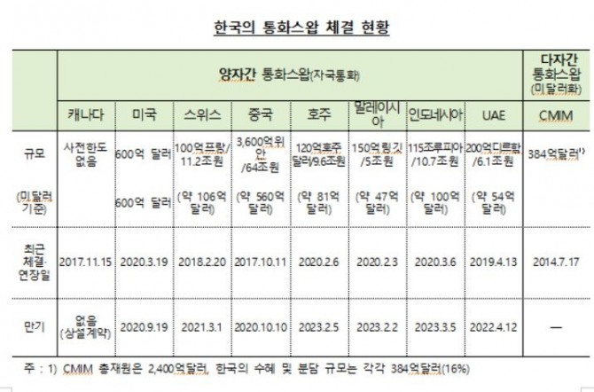 이번 미국과의 통화스와프는 글로벌 금융위기가 발생한 2008년 10월 30일 양국 간 맺은 통화스와프 계약에 이어 두 번째다. 그때도 300억 달러를 6개월 기한으로 체결했지만 2010년 2월 1일까지 9개월이 연장됐다
