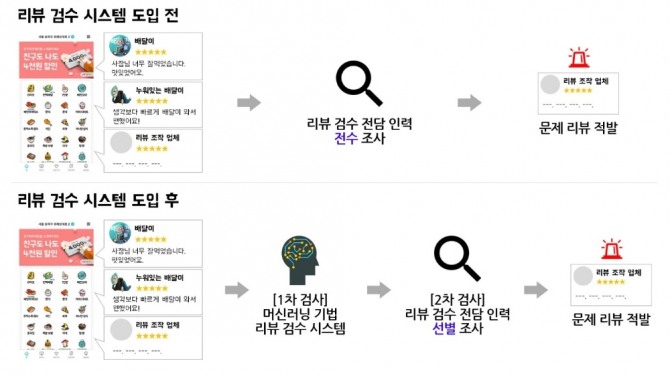 우아한형제들은 부정 리뷰 탐지 기술도 고도화하고 있다. 지난해 10월부터는 다양한 인공지능(AI) 기술을 활용한 리뷰 검수 기능을 도입했다. 인공지능이 모든 리뷰를 대상으로 개인정보노출 여부, 음란하거나 부적절한 내용 여부 등을 1차 분류한 뒤 내용을 탐지하면, 검수 전담팀은 그 가운데 위험 리뷰를 세밀하게 살핀다.