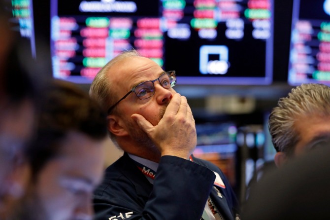 뉴욕 증권거래소에서 28일(현지시간) 한 주식 중개인이 주가 하락 폭이 커지는 것을 나타내는 전광판을 심각한 표정으로 지켜보고 있다. 사진=뉴시스