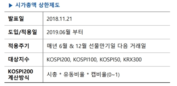 시가총액비중 상한제도(CAP)는 거래소에서 지수 내 특정종목의 비중을 30%로 제한하는 제도를 뜻한다. 지난 2018년 6월부터 도입돼 적용되고 있다. 핵심은 5월과 11월 마지막 거래일 기준으로 직전 3개월간 평균 시가총액 편입비중이 30%를 초과할 경우, 30%를 초과하는 %(포인트)만큼 하향조정하는 것이다.