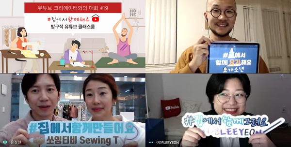 2일 유튜브는 '19회 유튜브 크리에이터와의 대화' 행사를 통해 실내 격리된 일상에서 우울감을 떨칠 수 있도록 도움을 주는 운동, 취미 생활 관련 유튜브 크리에이터 3팀을 소개했다. 이날 소개된 대표 크리에이터로는 손쉽게 따라 할 수 있는 미싱(바느질), 리폼 노하우를 공유하고 있는 쏘잉티비(윤정린, 진호영 씨), 요가 수련 콘텐츠를 제공하는 요가소년(한지훈 씨), 그림 그리기 콘텐츠를 공유하는 이연(이연수 씨) 등이다.