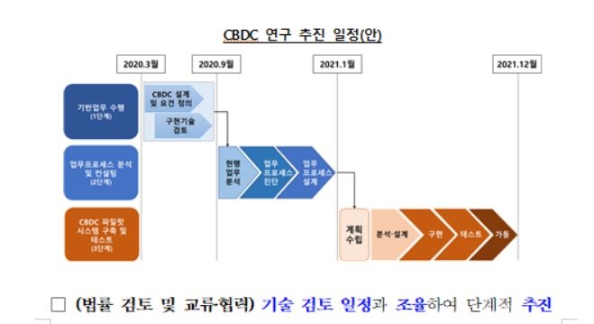 한은은 "CBDC 도입시 예상되는 법적 이슈를 검토하고 한국은행법 등 관련 법령의 개정 필요사항에 대하여 구체적인 개정 방안을 마련할 계획"이라며 "CBDC 관련 대외 여건 변화를 면밀히 모니터링하고 주요국의 연구 성과를 공유하기 위해 중앙은행간 정보 교류와 협력을 강화한다"고 설명했다.