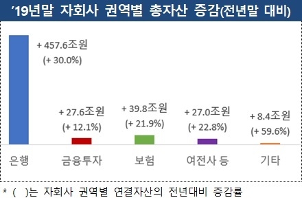 금융지주 총자산 증가액의 대부분은 은행권역이 차지하고 있다. 자료=금융감독원