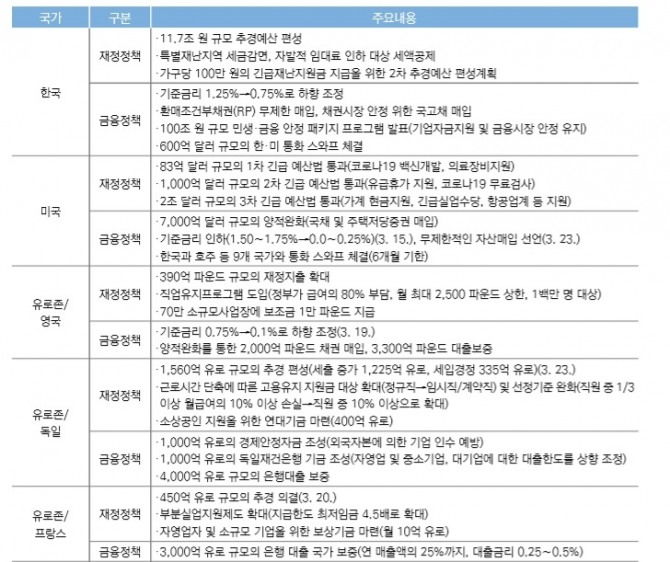 7일 국회입법조사처의 '코로나19 관련 국내외 경기부양책 현황 및 시사점'이라는 보고서에 따르면 코로나19 사태에 대응, 미국, 독일, 영국, 프랑스 등 선진국은 각각 국내총생산(GDP)의 6.3∼1.8%만큼의 재정 지출을 계획했다.