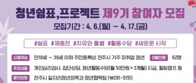신청방법은 전주시 홈페이지의 새소식 란에 게시되는 청년쉼표 제9기 참여자 모집 공고를 확인 후, 구비서류를 이메일로 제출하거나 전주시청 일자리청년정책과로 방문해 제출하면 된다.