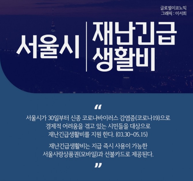 서울시가 신종 코로나바이러스 감염증(코로나19)으로 경제적 어려움을 겪고 있는 시민들을 대상으로 재난긴급생활비를 지원 한다. (03.30~05.15)