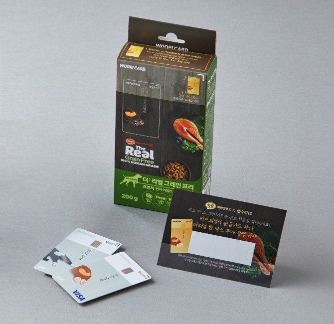 이미지 확대보기이번 콜라보에는 우리카드의 펫팸족 특화상품인 ‘카드의정석 댕댕냥이’ 디자인이 활용됐다. 이 카드의 귀엽고 친숙한 이미지를 반려동물 전용사료인 ‘더리얼’ 제품의 패키지 디자인으로 적용시켰다.