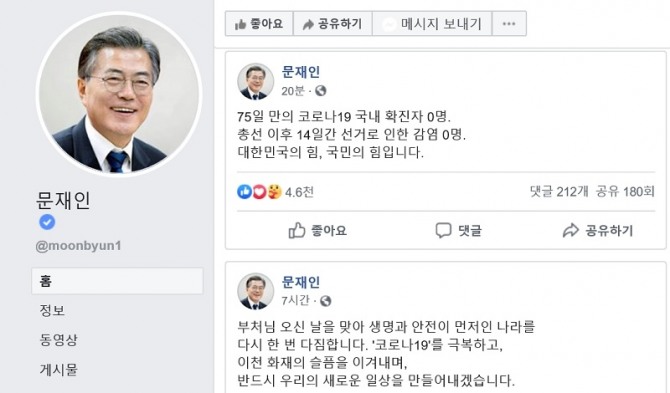 이미지 확대보기문 대통령은 30일 오후 페이스북 등 사회관계망서비스(SNS)에 ”75일 만의 코로나19 국내 확진자 0명. 총선 이후 14일간 선거로 인한 감염 0명. 대한민국의 힘, 국민의 힘입니다“라는 소감 글을 올렸다.