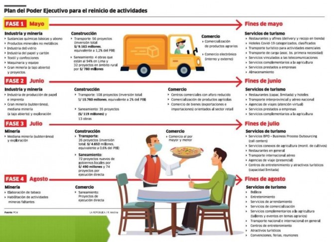 페루 정부는 2개월 동안 진행된 사회강제격리의 마지막 날을 앞둔 1주일 전인 2020년 5월 3일 대통령령 080-2020을 통해 10일 자로 현재의 사회강제격리를 종료하며 경제를 재활성화할 수 있는 방침을 발표하였다. 해당 방침은 점진적인 방식으로 진행될 것이며, 산업의 주요도에 따라 4단계에 나눈 업무 재개 방법이다. 그러나 지난 5월 2일 토요일 대통령 담화발표를 통해 정부는 이 방침을 발표함과 동시에 아직 페루는 코로나바이러스 팬데믹의 최정점에도 도달하지 않은 상태이며, 이에 따라 업무가 재개되어도 공중보건이 최우선순위임을 재차 강조하였다. 이에 따라 각 사업장은 업무 재개 전 회사 위생 방침(Lineamientos para la vigilancia de la salud)을 작성하여 보건부의 사전승인을 받아야만 재개가 가능하다.