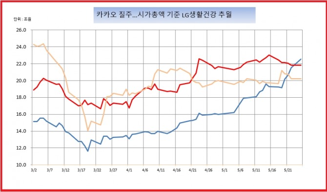 같은 시각 LG생활건강은 0.5% 하락하며 시가총액 21조 7천억으로 밀려났다.