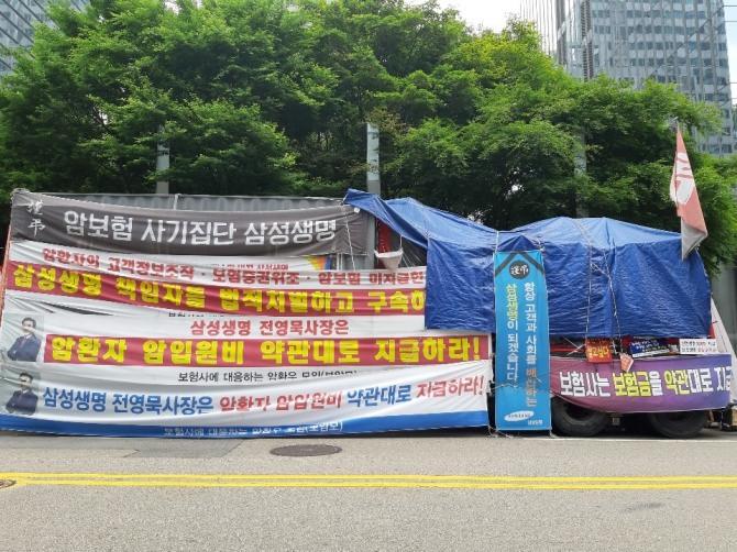 암보험금 지급 문제를 두고 삼성생명과 암보험 가입자 간 갈등이 격화되고 있다. 삼성생명은 최근 삼성생명 사옥에서 농성 중인 ‘보험사에 대응하는 암환우 모임’(보암모) 회원들을 상대로 업무방해 금지 가처분 신청 등 법적 조치를 취했다. 이에 보암모는 지난 26일 국회에서 ‘삼성생명의 보암모 집회 등 업무방해 금지 가처분 신청 규탄 기자회견’을 열었다.