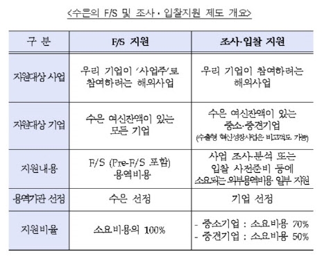 이번 지원 제도의 주요 내용은 ▲해외 대형 투자개발형사업에 대한 사업타당성조사 비용 지원 ▲중소·중견기업의 해외 시장조사와 입찰 사전준비에 필요한 외부용역비용 지원 등 크게 두 가지다.