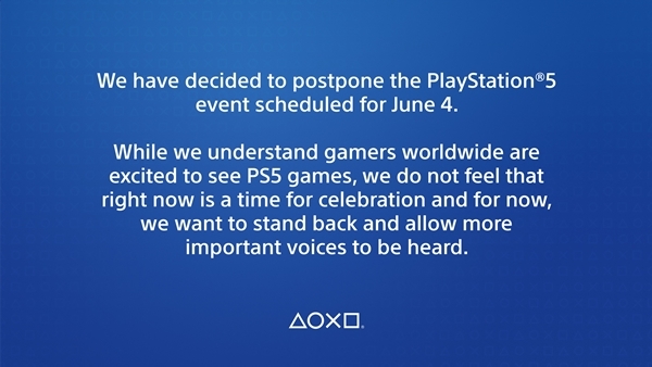 이 같은 결정은 최근 미국 미네소타주에서 일어난 조지 플로이드 사망 사건에 영향을 받았을 것으로 풀이된다. 당초 소니는 4일 PS5 게임 공개 행사를 온라인으로 개최하고 게임 라인업을 발표할 계획이었다.
