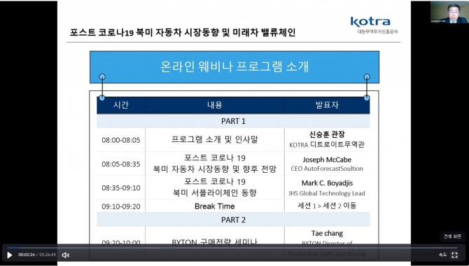 KOTRA 디트로이트무역관 신승훈 관장의 웨비나 프로그램 소개 화면
