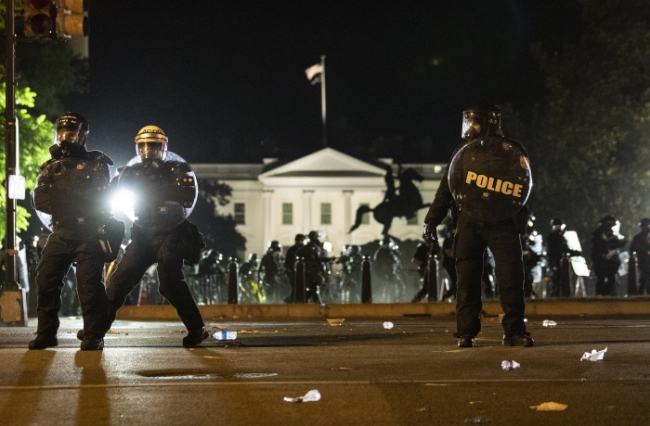 미국 워싱턴 백악관 근처에서 지난달 31일(현지시간) 흑인 남성 조지 플로이드의 사망에 항의하는 시위대가 백악관에 접근하는 것을 막기 위해 경찰이 진압 대형을 갖추고 있다.