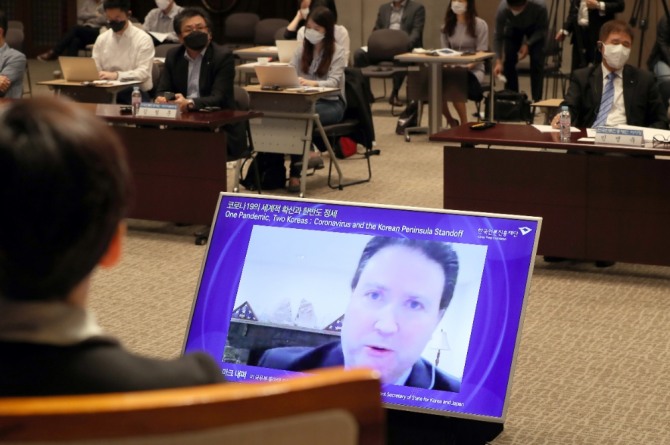 지난달 20일 오전 서울 중구 한국프레스센터 국제회의장에서 마크 내퍼 미국무부 부차관보가 영상으로 한미동맹 등 현안을 주제로 한 발제를 하고 있다. 사진=뉴시스