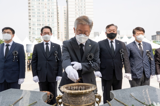 이재명 경기도지사는 6일 수원 현충탑에서 개최한 제65회 현충일 추념식에 참석해 순국선열과 호국영령의 명복을 빌고 유가족을 위로하며 “국가유공자와 유가족 등 공동체를 위해 헌신한 분들이 존경받고 대우받는 것이 상식인 나라를 만들어야 한다”고 말했다.