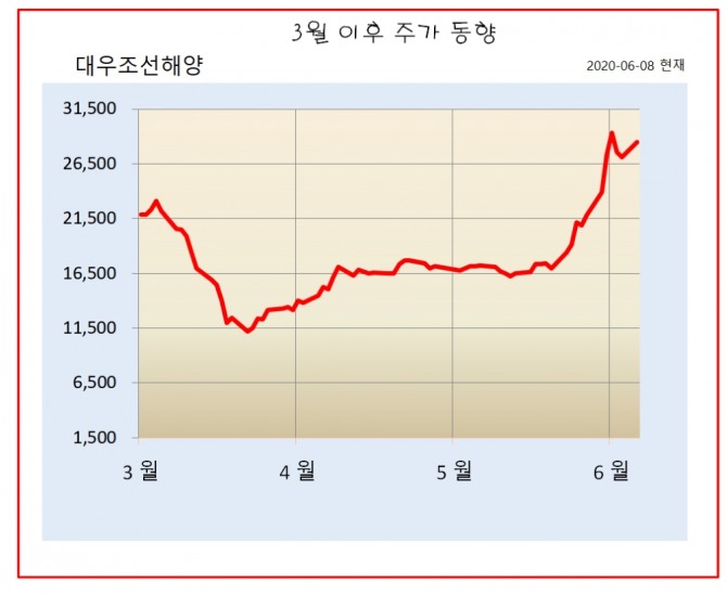 지난 3월 2일 이후로 살펴보면 대우조선해양의 최저가는 11200원이었으며, 최고가는 29350원을 기록했다.