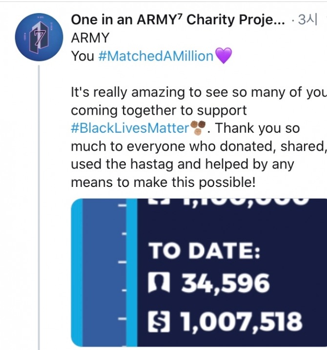 그러던 중 방탄소년단과 빅히트가 '흑인의 생명도 중요하다' 캠페인 측에 100만 달러를 기부했다는 사실이 알려진 뒤 '매치 어 밀리언(Match A Million)'이라는 해시태그와 함께 100만 달러를 목표로 추가 모금을 시작했다.