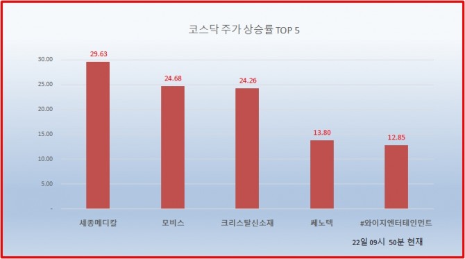 [코스닥] 상승률 상위 50 종목...세종메디칼 상한가, 모비스, 크리스탈신소재, 쎼노텍 순
