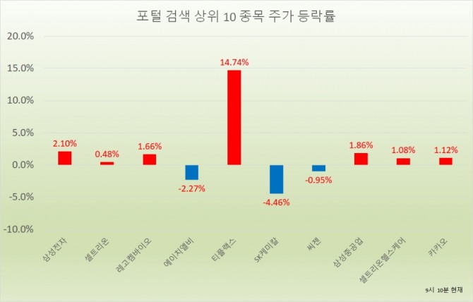 이미지 확대보기30일 오전 9시 10분 현재 포털사가 집계하는 검색량 기준 상위 20개 종목의 현황은 다음과 같다.