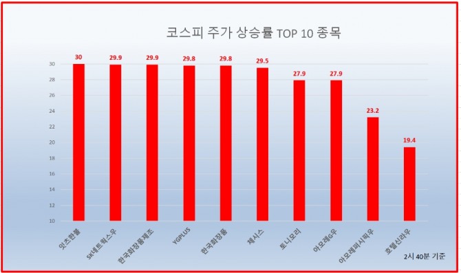 표기 순서는 코스피 종목 중 상승률 순위, 종목명, 현재가, 상승률 순이다.