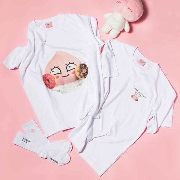 이번 콜렉션은 아크메드라비에서 가장 인기있는 ‘베이비 페이스’ 디자인을 오마쥬한 것이 특징이다. 티셔츠에는 아기 얼굴 대신 도너츠를 든 어피치와 라이언, 히어로 분장을 한 라이언, 기도하는 천사 어피치 등의 3D 이미지가 삽입됐다. 협업 로고를 제품 곳곳에 배치해 카카오프렌즈만의 귀여움을 살렸다.
