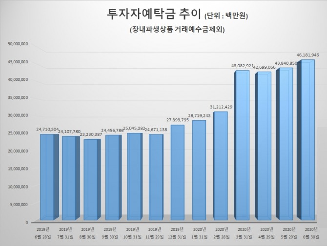 지난해 6월 28일 기준 증시 투자자예탁금은 24조7103억400만 원이었으나 올해 6월 30일 46조1819억4600만 원으로 약 두배 규모로 증가했다.