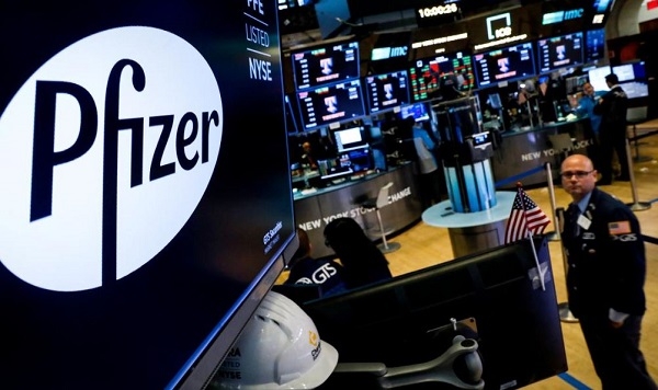 미국 증권거래소의 전광판에 나타난 화이자 로고. 사진=로이터