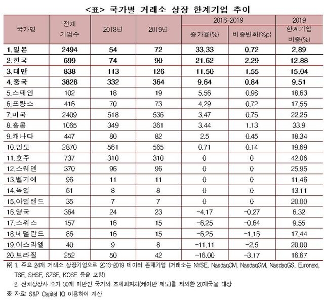 보고서는 세계 20개국의 상장기업을 비교한 결과, 우리나라 상장 한계기업 수는 2018년 74개에서 2019년 90개로 21.6% 증가, 일본의 33.3%에 이어 두 번째로 높았다고 지적했다.