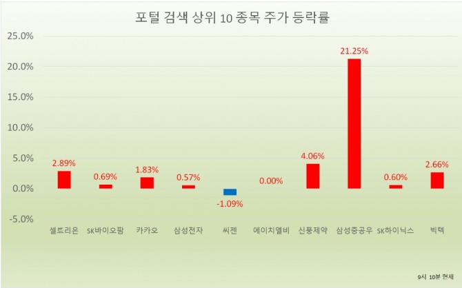 이날 오전 9시 10분 현재 포털사가 집계하는 검색량 기준 상위 20개 종목의 현황은 다음과 같다.