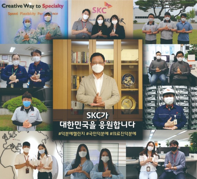 이미지 확대보기SKC 이완재 사장과 구성원들이 신종 코로나19 바이러스감염증(코로나19) 확산 방지를 위해 힘쓰고 있는 의료진과 국민에게 감사와 응원의 마음을 전하는 ‘덕분에 챌린지’에 참여했다.