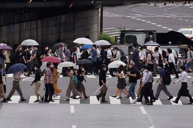 10일 일본 도쿄에서 코로나19 확산을 막기 위해 마스크를 쓴 사람들이 건널목을 건너고 있다. AP/뉴시스이미지 확대보기