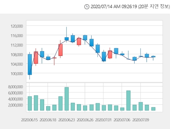 이미지 확대보기셀트리온헬스케어 주가는 14일 오전 9시 19분 현재 전거래일 대비 0.84% 오른 10만7500원에 거래되고 있다. 자료=한국거래소