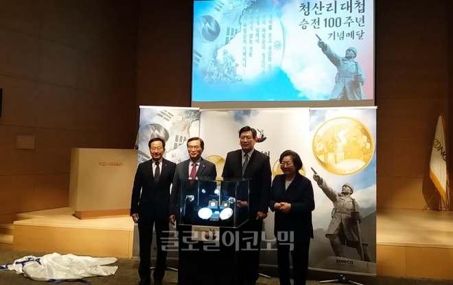 이미지 확대보기조폐공사는 16일 서울 서대문구 풍산빌딩에서 화폐유통업체 풍산화동양행과 함께 '청산리대첩 승전 100주년 기념메달' 공개식을 개최했다.