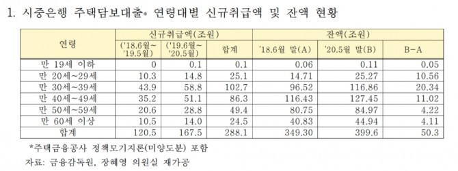 27일 장혜영 정의당 의원이 금융감독원으로부터 받은 자료에 따르면 2018년 6월부터 올해 5월까지 2년 동안 30대가 받은 시중은행의 신규 주택담보대출이 102조7000억 원에 달한 것으로 나타났다.