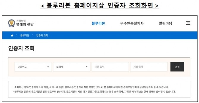 협회는 보험소비자가 블루리본 인증자 정보를 확인할 수 있도록 블루리본 홈페이지상 인증자 정보를 공개하고 인증자에게는 디지털 인증서를 제공하고, 블루리본 전용 명함과 인증패·뱃지를 부여함으로써 인증자의 자긍심을 고취하고, 대외 영업 시 활용할 수 있도록 할 예정이다.