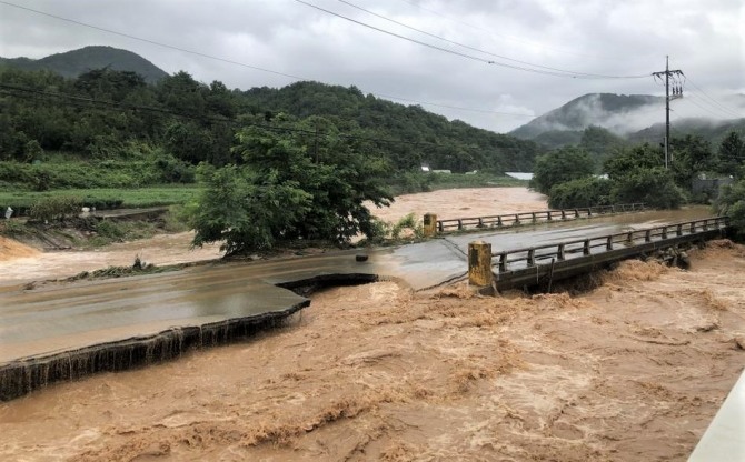 2일 오전 큰 비가 내린 충북 단양군 매포읍 매포천 수위가 상승하면서 도로 일부가 유실됐다. 사진=단양군