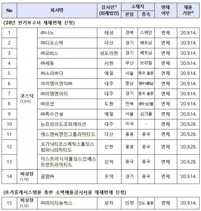 5일 금융위원회는 지난 7월20일부터 24일까지 제재면제를 신청한 13개 코스닥시장 상장기업과 2개 비상장기업의 반기보고서 등의 제출기한을 30일 연장했다고 밝혔다.