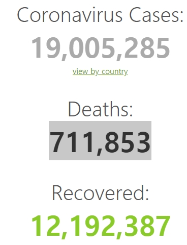 이미지 확대보기국제통계 사이트 월드오미터 집계에 따르면 한국 시각 6일 오후 7시 30분 기준 전 세계 총 감염자 수는 1900만5285명이며 전 세계 사망자 수는 71만1853명이다.