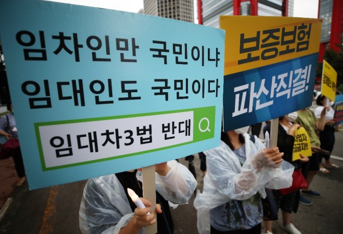참가자들은 '임대차3법 위헌', '소급철폐 위헌타도', '국민은 개돼지가 아니다' 등의 팻말을 들고 "공공임대 좋으면 여당부터 임대 살라", "지역주민 협의 없이 공공임대 짓지 말라" 등의 구호를 외쳤다.