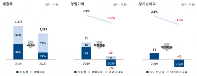 화장품 사업은 누적 매출액 974억 원, 영업이익 45억 원으로 각각 39.8%, 80% 감소했다. 코로나19의 영향으로 국내외 화장품 시장의 위축과 색조 화장품 수요 감소로 주요 채널의 실적이 하락했다. 그러나 대표 화장품 브랜드 ‘AGE 20’s’(에이지 투웨니스)가 지난 6월 세계 최대 전자상거래 업체 ‘아마존’에 진출하는 등 좋은 소식도 있었다. 중국 '6·18 쇼핑 축제'에서 전년 대비 약 50% 성장하는 성과를 얻었다.