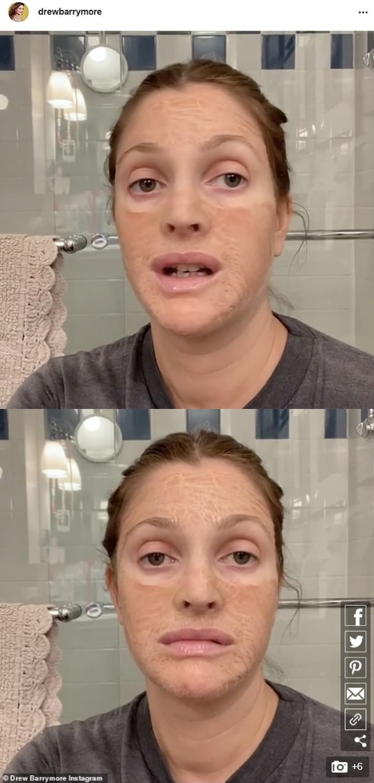 영상 속 드루 베리모어는 페이스 마스크가 서서히 건조되면서 얼굴이 뻣뻣해지는 각 단계를 웃으면서 자연스럽게 보여주었다. 차콜 셔츠를 입은 드루는 화장실에 서있는 동안 갈색 머리를 단단히 묶고 있다. 미용 마스크는 그녀의 피부에서 갈색 톤으로 건조되면서 비늘처럼 분리되기 시작했다.