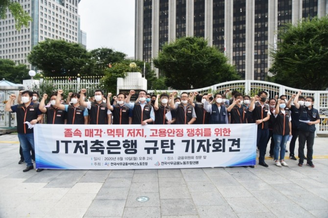 이미지 확대보기전국사무금융서비스노동조합 JT저축은행지회는 10일 서울 광화문 정부서울청사 앞에서 ‘JT저축은행 매각 관련 규탄’ 기자회견을 열고 “사측이 고용안정을 요구하는 노조와 협의를 일방적으로 거부하고 있다”고 비판했다.
