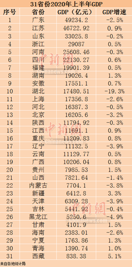 2020년 상반기 중국 6개 지역의 GDP가 2조 위안을 웃돌았으며, 19개 지역의 GDP가 1조 위안을 돌파했다.