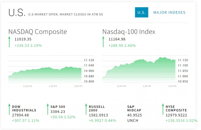 마감시세기준으로는 다우지수가 289.93포인트(1.05%) 오른 2만7976.84를 기록했다. 스탠다드앤푸어스(S&P)500 지수도 46.66포인트(1.40%) 뛴 3380.35로 체결됐다. 사상최고치 에 근접했다. 나스닥은 229.42포인트(2.13%) 급등한 1만1012.24로 거래를 마쳤다.