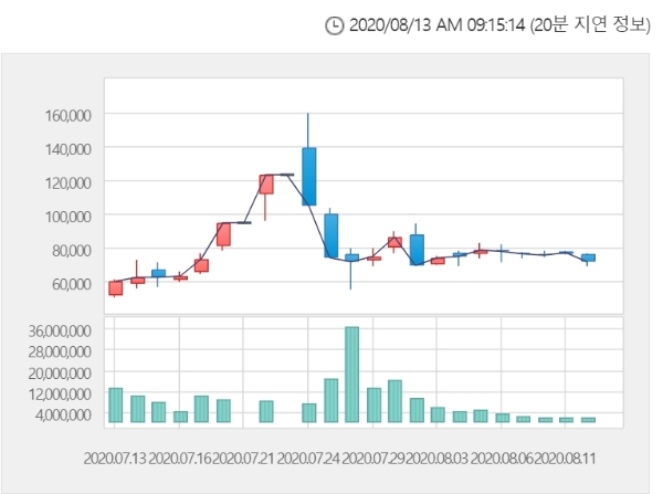 신풍제약 주가는 13일 오전 9시 11분 현재 전거래일 대비 9.05% 오른 7만8300원에 거래되고 있다. 자료=한국거래소
