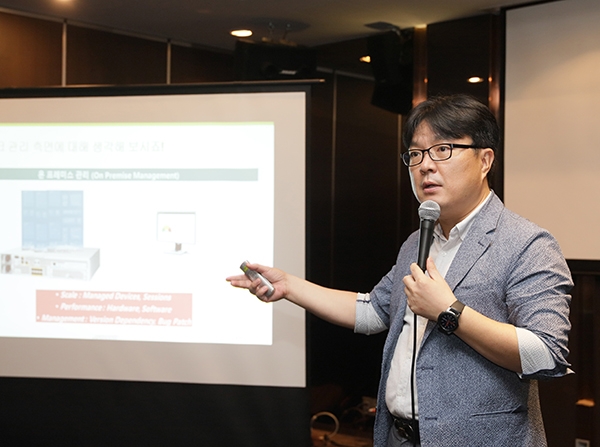 한국주니퍼네트웍스 김현준 시스템 엔지니어 기술 부문 이사가 기자간담회에서 세션을 발표하고 있다.
